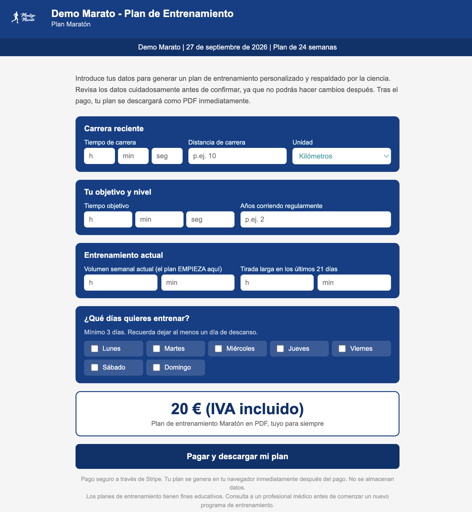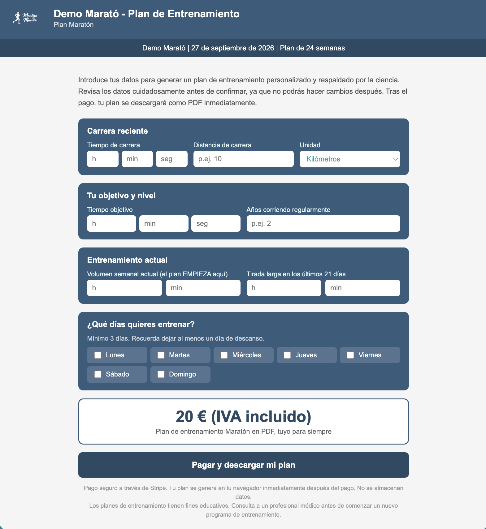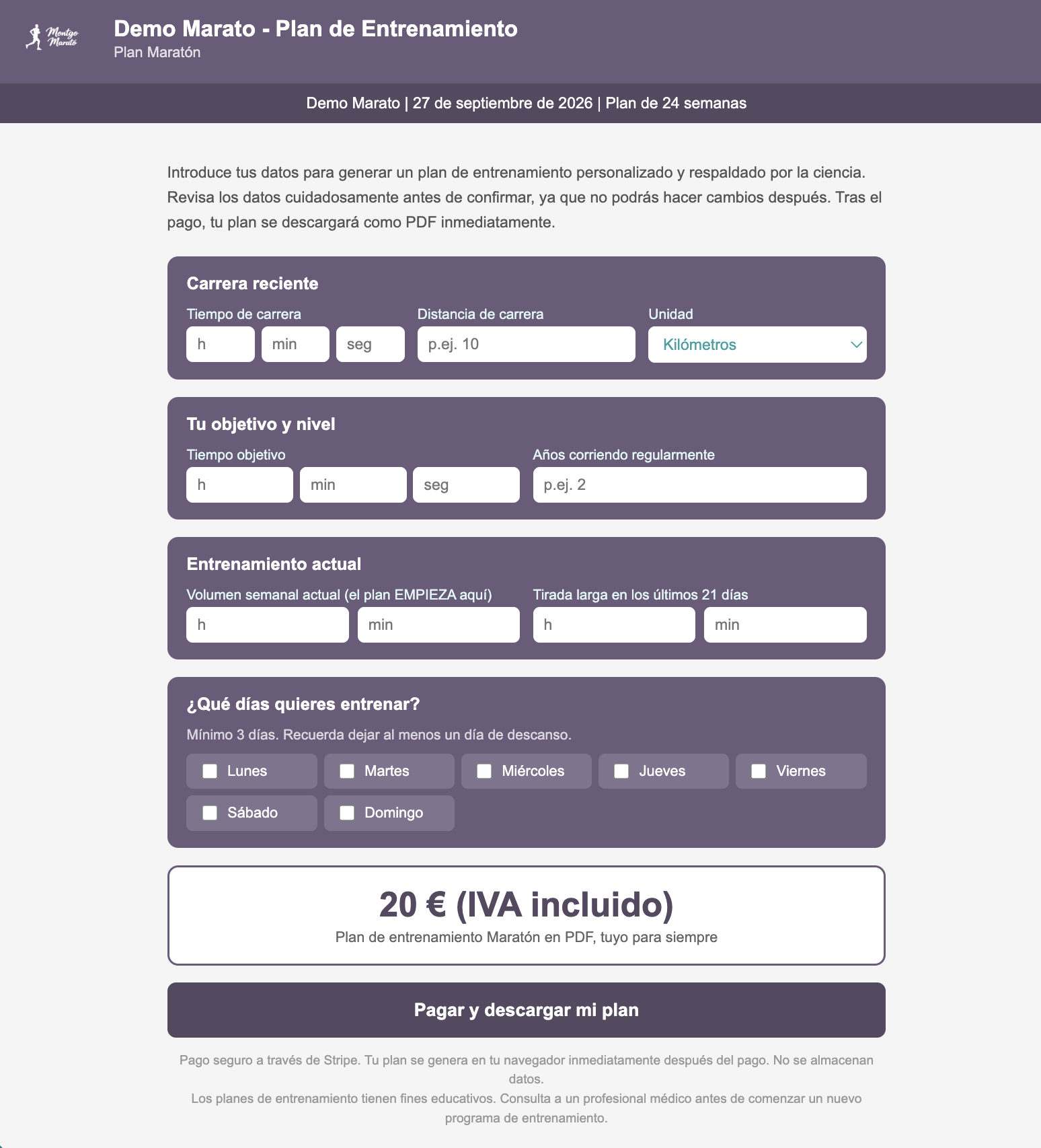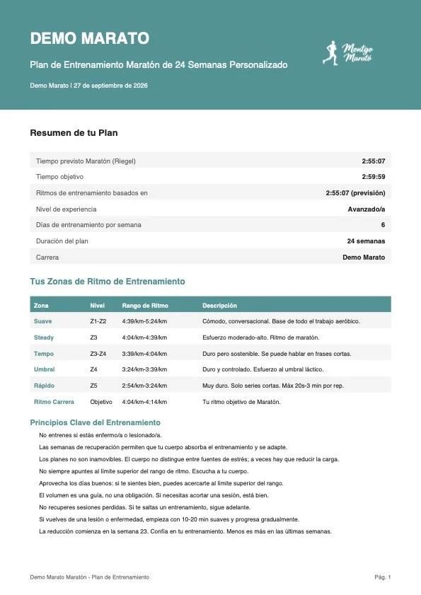 El plan de entrenamiento está diseñado con los colores de su marca y su logotipo. El encabezado incluye el nombre de su carrera y la fecha. Para el corredor, se muestra su tiempo previsto y su objetivo. Ellos eligen qué días correr.