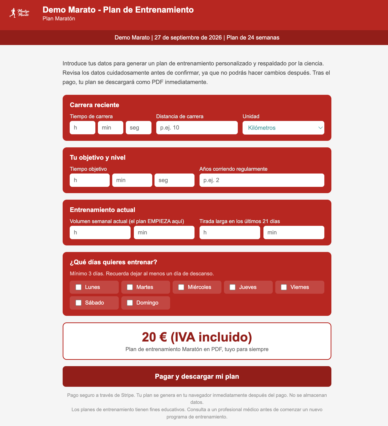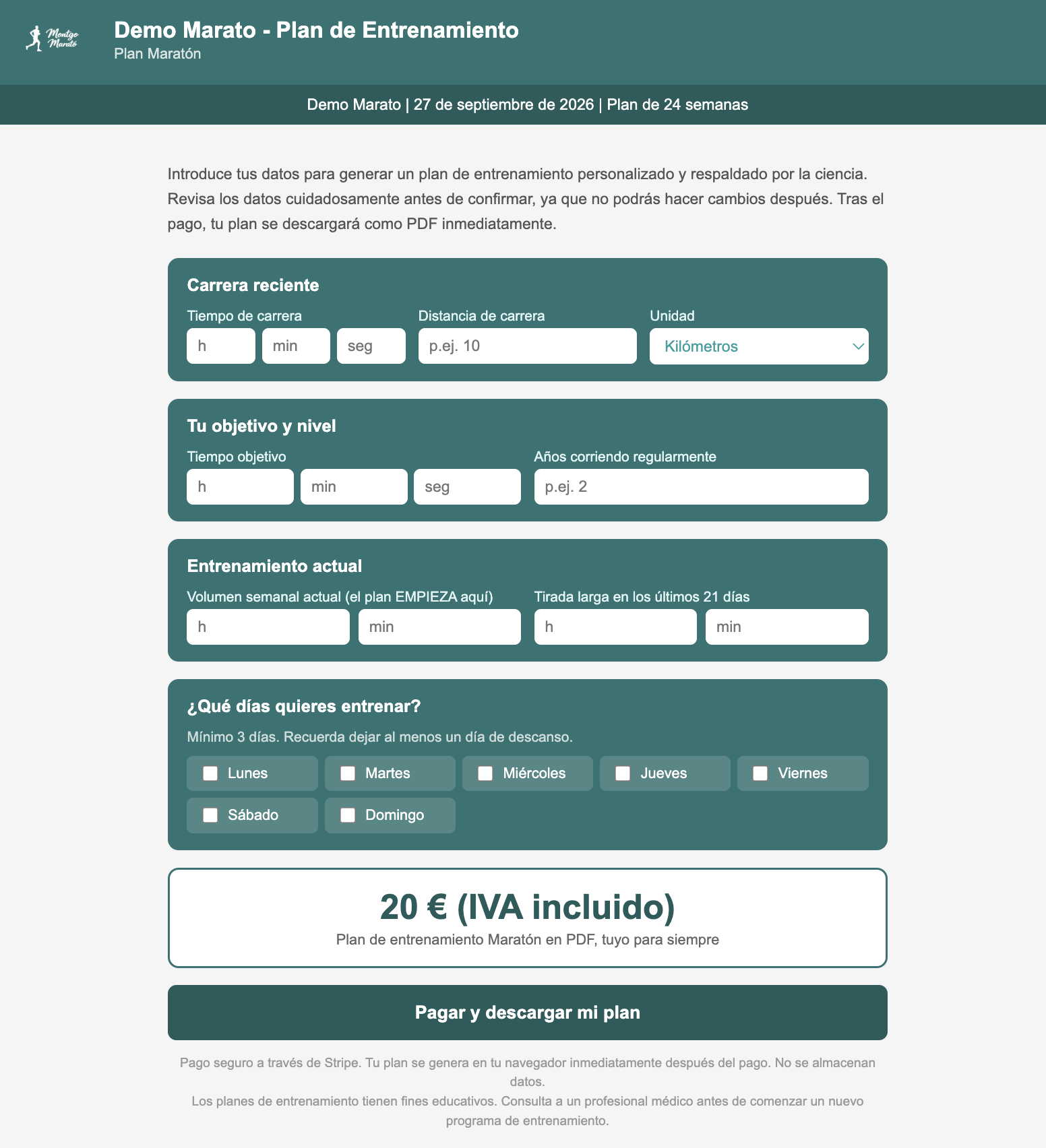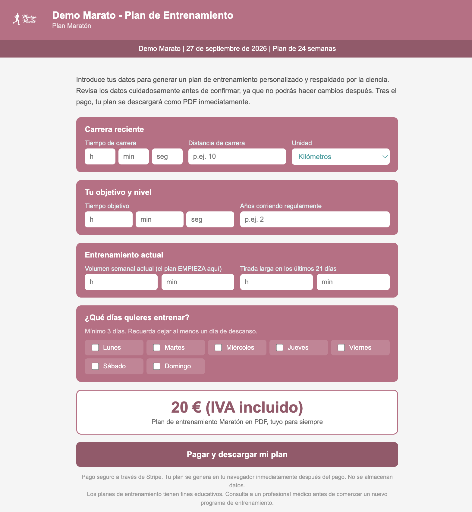 El plan de entrenamiento está diseñado con los colores de su marca y su logotipo. El encabezado incluye el nombre de su carrera y la fecha. Para el corredor, se muestra su tiempo previsto y su objetivo. Ellos eligen qué días correr.